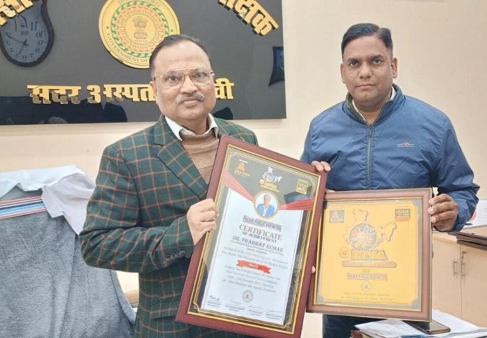 राँची (ख़बर आजतक) : पुलिस पब्लिक रिपोर्टर द्वारा आयोजित 13वें इंडिया नेशनल अवॉर्ड 2025 में रांची सदर अस्पताल के सिविल सर्जन डॉ. प्रभात कुमार को स्वास्थ्य क्षेत्र में उनके सराहनीय कार्यों के लिए सम्मानित किया गया। आयोजन स्थल पर डॉ. कुमार किसी जरूरी कार्य के कारण उपस्थित नहीं हो पाए।