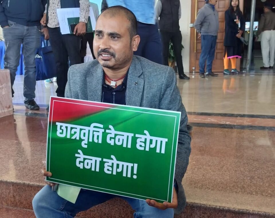 बकाया छात्रवृत्ति भुगतान को लेकर आजसू विधायक निर्मल महतो का विधानसभा के बाहर धरना