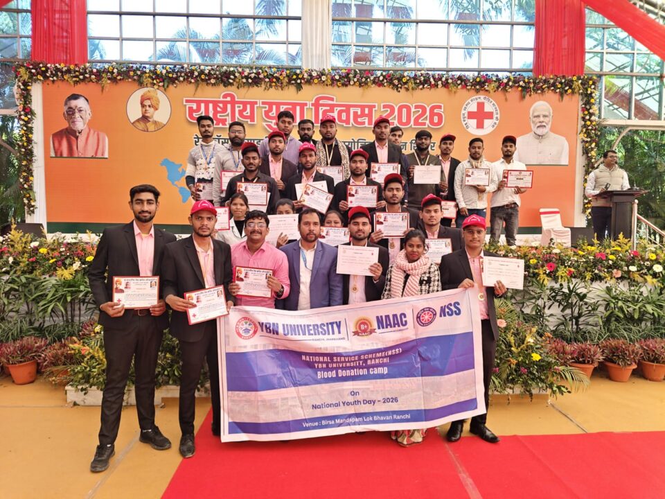 रांची (ख़बर आजतक) : राष्ट्रीय युवा दिवस के अवसर पर रांची के लोक भवन स्थित बिरसा मंडपम में आयोजित महा रक्तदान शिविर में वाई.बी.एन. यूनिवर्सिटी, रांची के छात्रों ने उल्लेखनीय भागीदारी निभाई। विश्वविद्यालय के एनएसएस समन्वयक के नेतृत्व में कुल 30 छात्रों ने उत्साहपूर्वक रक्तदान कर जरूरतमंदों को जीवन का उपहार दिया।